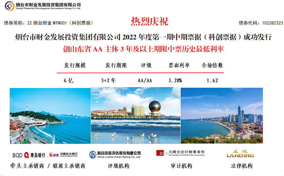 10月20日,集團(tuán)2022年度首期中期票據(jù)(科創(chuàng)票據(jù))成功發(fā)行!發(fā)行規(guī)模6億元,期限3+2年,票面利率3.28%,全場(chǎng)認(rèn)購倍數(shù)1.62倍,創(chuàng)山東省AA主體3年及以上期限中票歷史最低利率,同時(shí)也是山東省首筆基金類科創(chuàng)票據(jù),煙臺(tái)市首筆用途類科創(chuàng)票據(jù)。本期債券發(fā)行由青島銀行牽頭主承,光大銀行聯(lián)席主承,聯(lián)合資信、天圓全會(huì)計(jì)師事務(wù)所及蘭迪律師事務(wù)所分別提供信用評(píng)級(jí)、審計(jì)和法律服務(wù)。