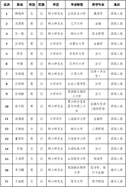 按照面試成績排名,本次擬確定15人進入公示環(huán)節(jié),另確定2人為遞補人選,如前15人無法按時入職,將從遞補人員中按照表中順序依次遞補。